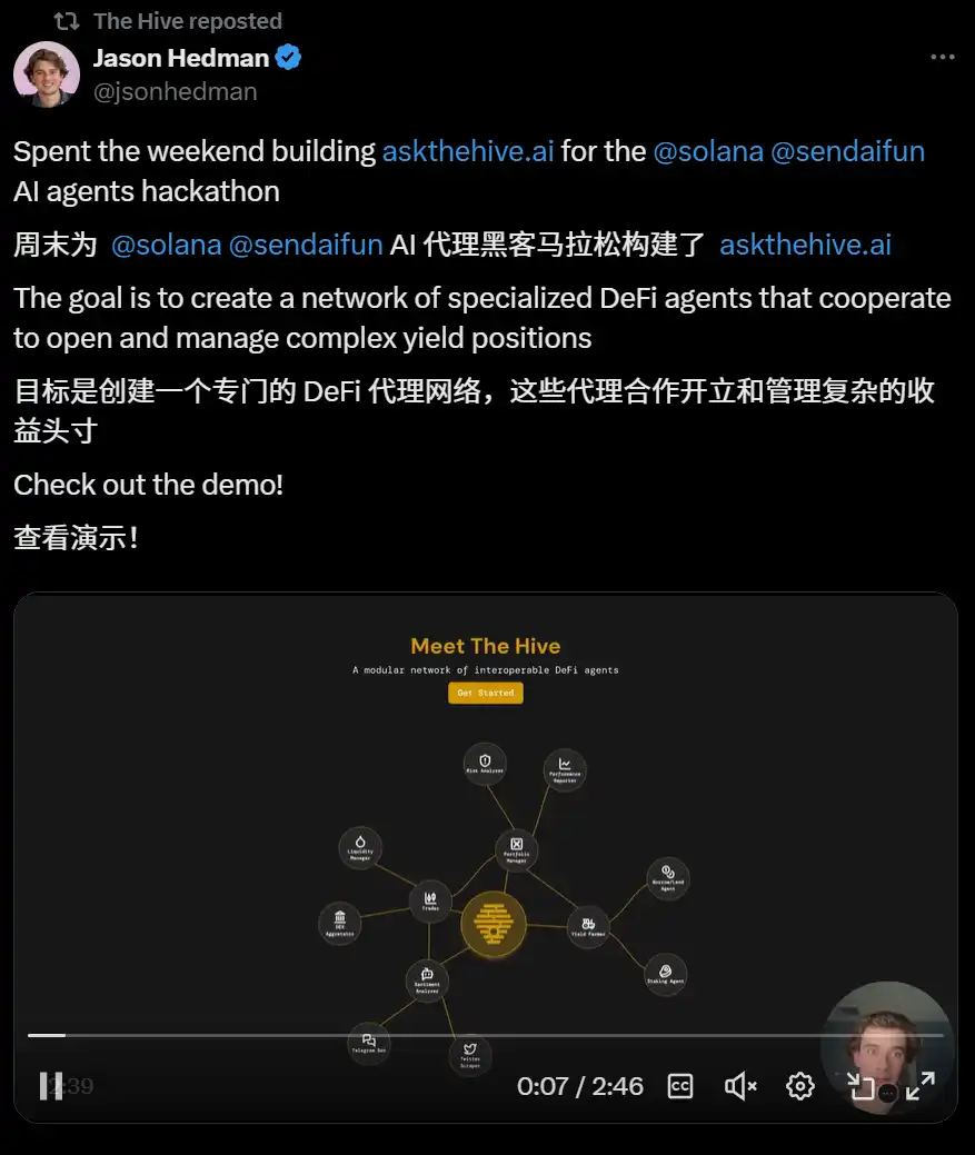 BUZZ代币的市场表现值得关注。根据Hive的市场活动和社群反馈,BUZZ已在Solana生态系统中建立了一定的声誉。特别是,Jason Hedman在AI和DeFi领域的成就,使得BUZZ成为投资者关注的焦点。Jason曾在微软生产式AI黑客松中夺冠,并在Solana链上的AI黑客松比赛中表现出色,使得BUZZ在未来可能的AI黑客松中成为夺冠热门。