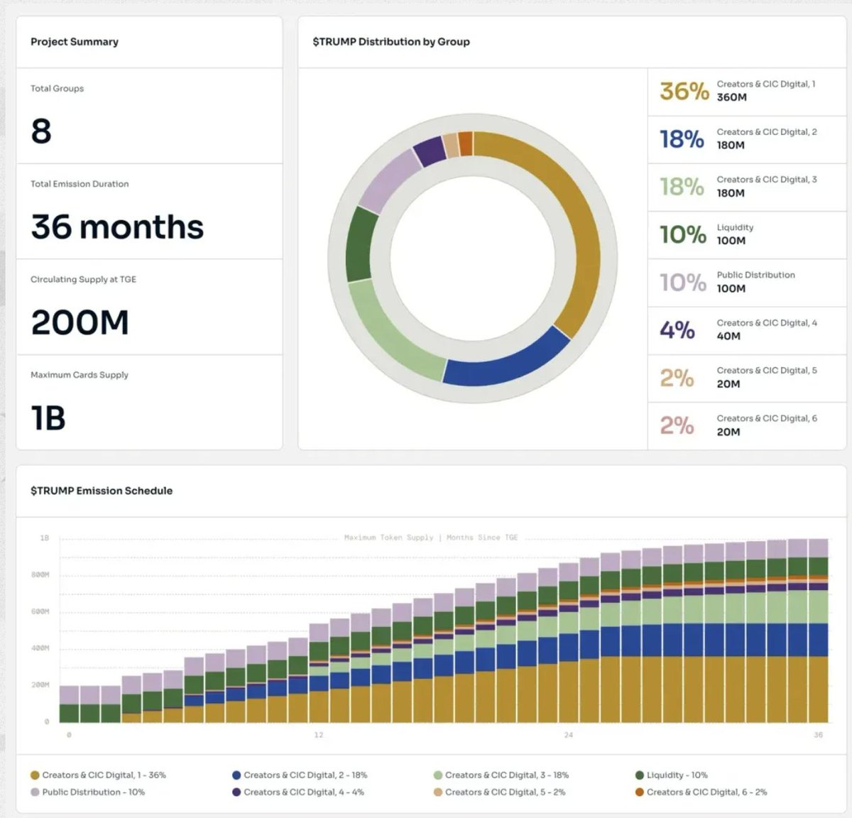 $TRUMP的经济模型设计既大胆又独特。初始供应设定为2亿枚代币,在三年内逐步增至10亿枚。80%的代币被分配给CIC Digital LLC和Fight Fight Fight LLC,这两家公司均与特朗普组织有关联。这样的分配策略在Meme币中并不常见,它反映了项目的长期视野和对代币价值增长的信心。然而,这种高度集中化的代币分配也引发了一些关于项目去中心化程度和透明度的讨论。