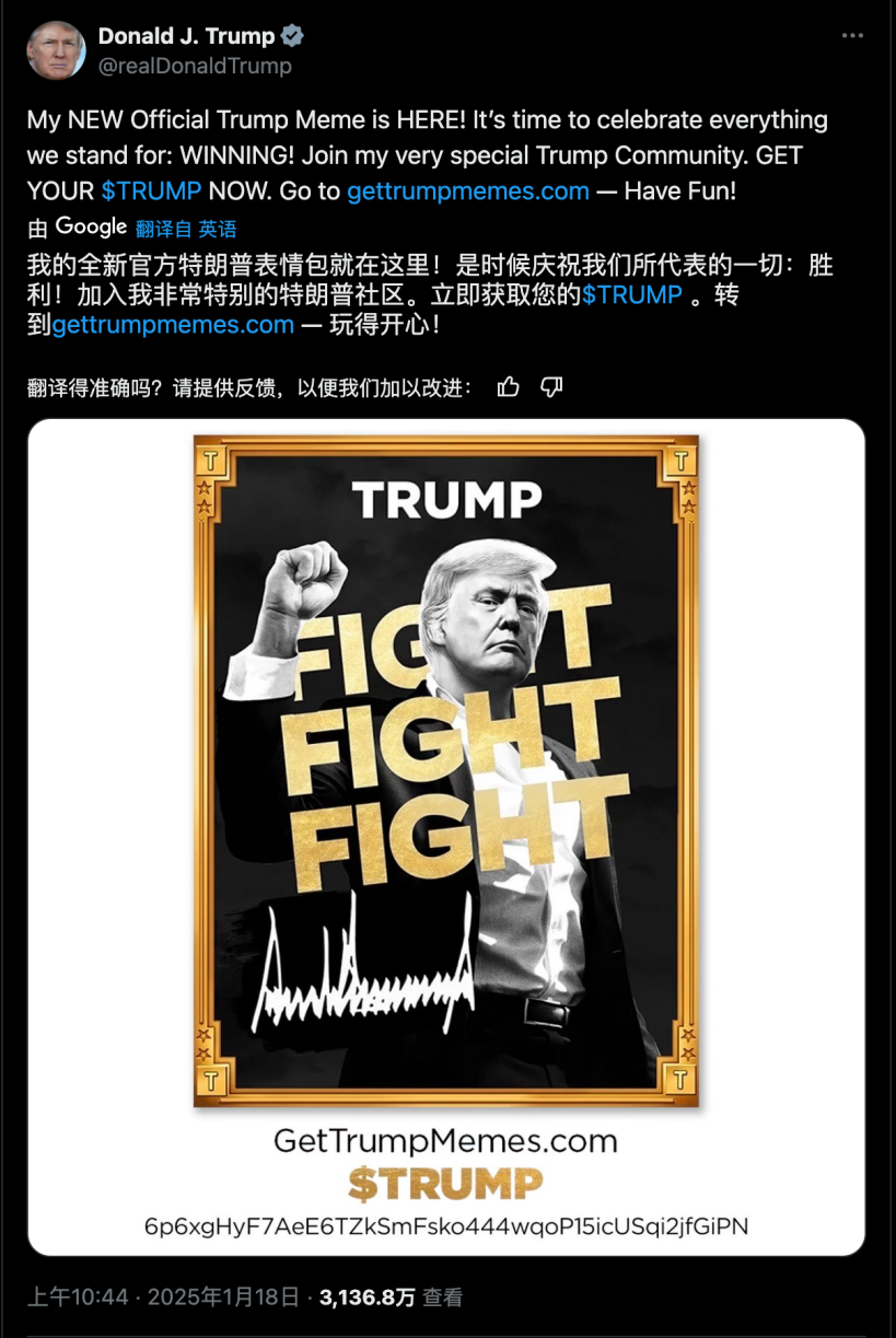 特朗普官方Meme币$TRUMP横空出世:从零到市值186亿美元的传奇之路