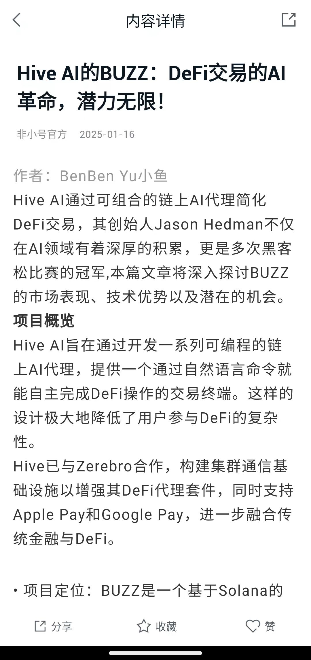 非小号投研分析师准确指出了Hive AI的核心竞争力——通过AI代理简化DeFi操作。这一技术优势使得BUZZ能够有效降低用户参与DeFi的门槛,同时借助Solana区块链的高速度和低交易成本,确保智能合约的高效运作。