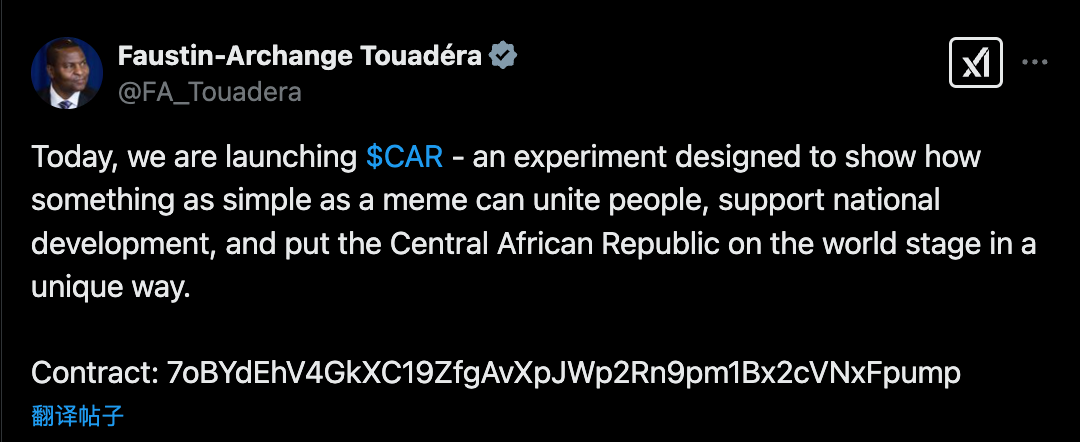 中非共和国总统Faustin-Archange Touadéra通过其X平台官方账号发布了一条推文,声称将推出名为CAR的Meme币,并称该币旨在借助Meme的力量将中非共和国推向世界舞台。