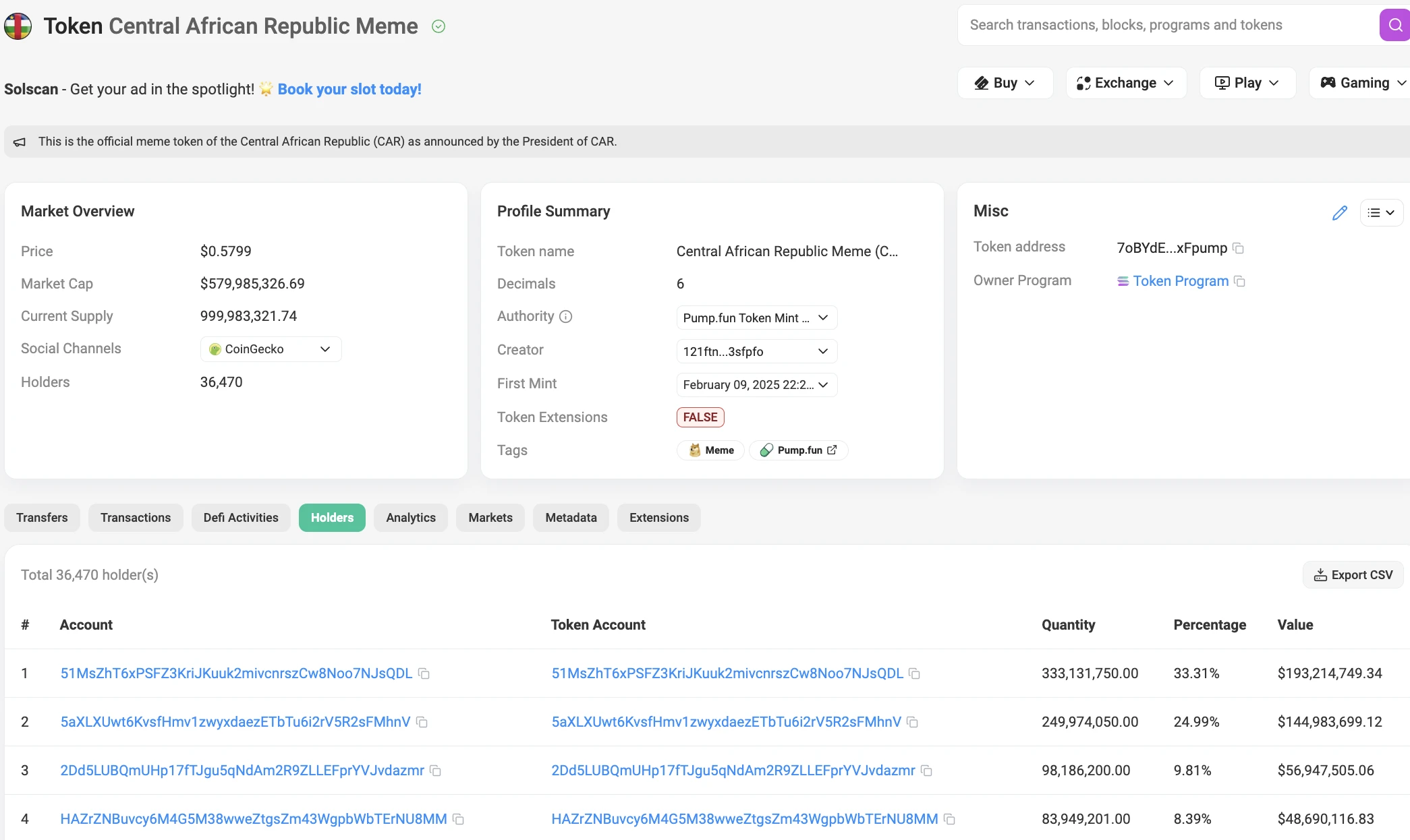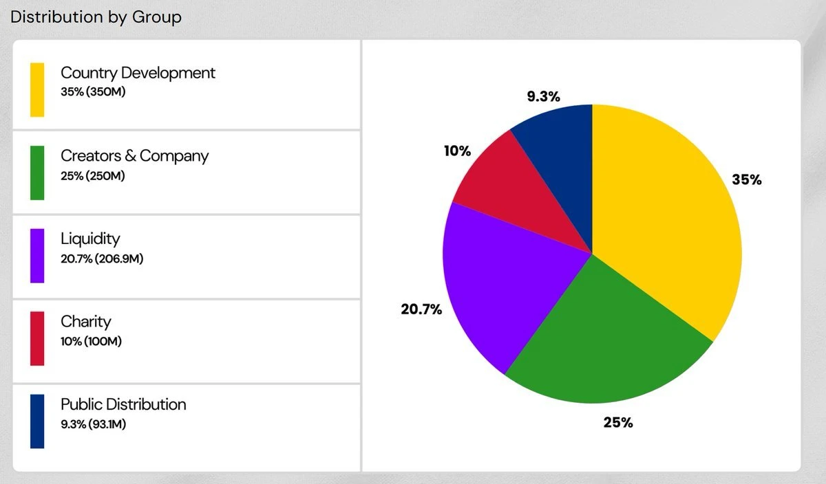 从代币经济模型来看,CAR币的分配和流动性也存在诸多问题。据项目官网信息,CAR代币仅有9.3%的公开发配,其中35%将用于中非共和国国家发展,25%分配给创作者及公司,20.7%用于流动性注入,10%分配给慈善机构。