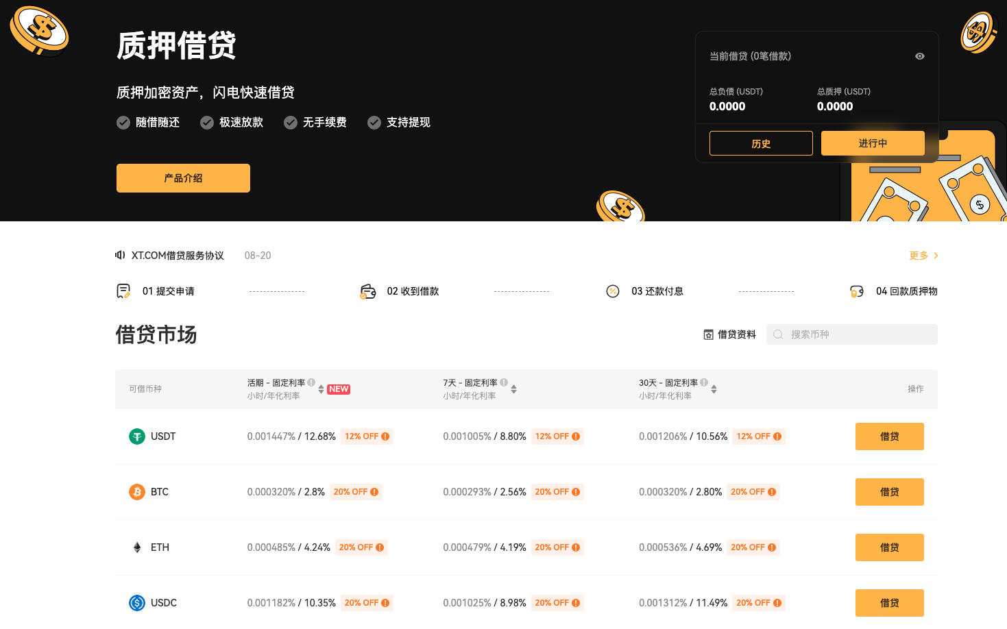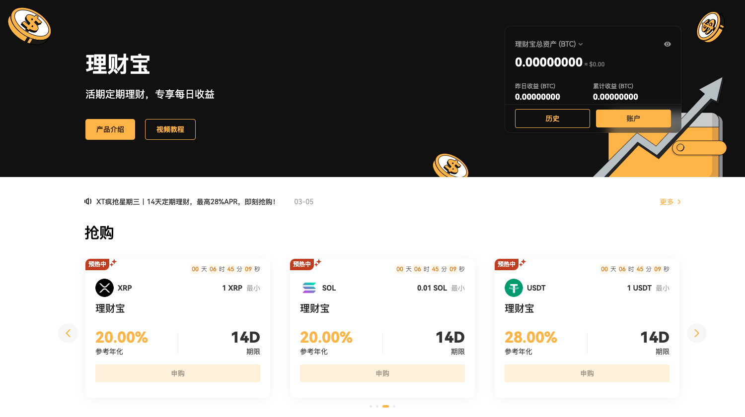 - - 全面的收益产品组合:从 简单赚币(活期理财、连上赚币、云算力、财富管理)到 高级投资(鲨鱼鳍、双币理财)、Launchpool 以及质押借贷,XT Earn 为新手和资深投资者提供广泛的理财选择。