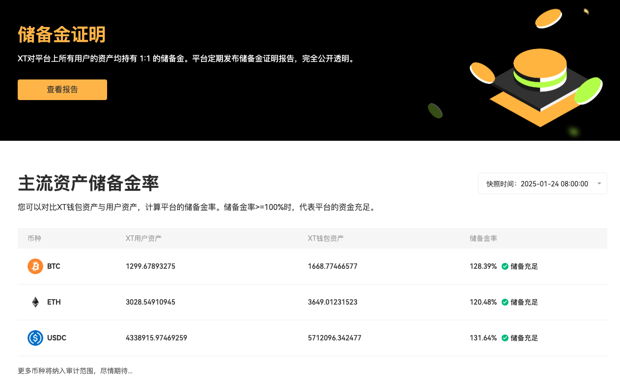 合规与资金安全保障:XT.COM 持有 美国 MSB 牌照,采用 冷钱包存储 和 Merkle Tree 资产储备证明,确保用户资产安全无忧。