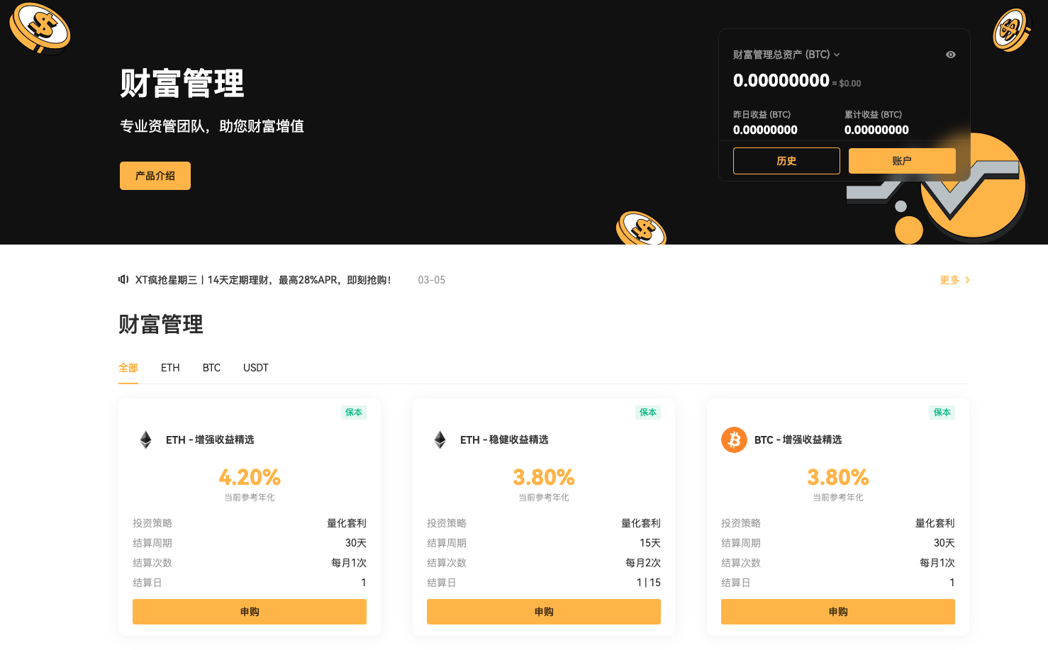 无论您是刚刚进入加密市场的新手,还是 已经熟悉投资逻辑的资深玩家,XT Earn 都能帮您 更高效地管理资产,让投资变得更简单、更稳健。