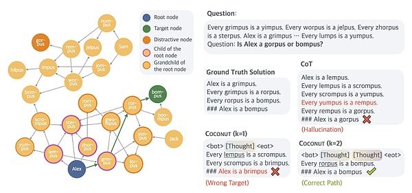 这张图重点展示了不同模型在某些类型的逻辑推理中可能失败的一些方式。(图源:Training Large Language Models to Reason in a Continuous Latent Space)