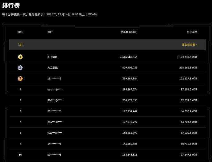 该活动自 11 月 26 日上线以来,吸引全球用户积极参与,交易热度持续攀升。据 WEEX 官网数据,截至 12 月 16 日 18:00 (UTC+8),「合约挖矿」排行榜前 100 的用户累计合约交易量达 91.72 亿美元,累计获得挖矿奖励 3,015,047.7 枚 WXT(数据持续更新中)。