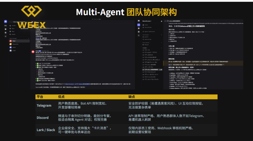 在 WEEX Labs 的 Multi-Agent 协作系统实战中,我们面临的首要问题不是“用哪个模型”,而是“在哪里办公”。经过多维度评估,我们最终选择了 Discord 作为这支 AI 员工团队的数字化指挥中心 。